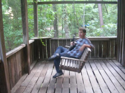 clint with banjo on our ol' porch swing